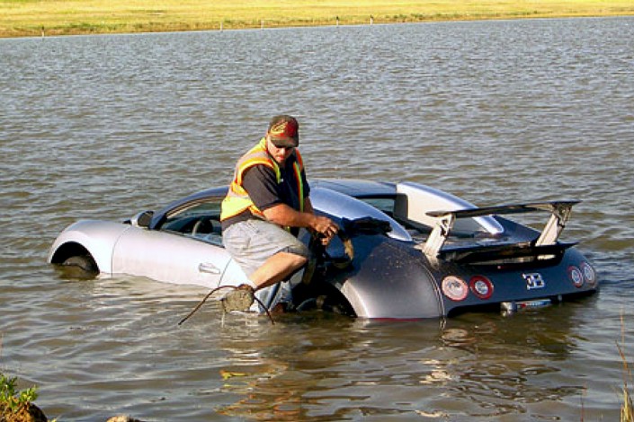 Одна из самых знаменитых аварий суперкаров случилась в лагуне Мексиканского залива. В прямом смысле - в 2009-м там утонул Bugatti Veyron техасца Энди Хауса. Хаус потребовал у страховой компании двойную стоимость гиперкара, но позднее чуть не отправился за решетку - выяснилось, что он целенаправленно утопил машину ради страховой выплаты.