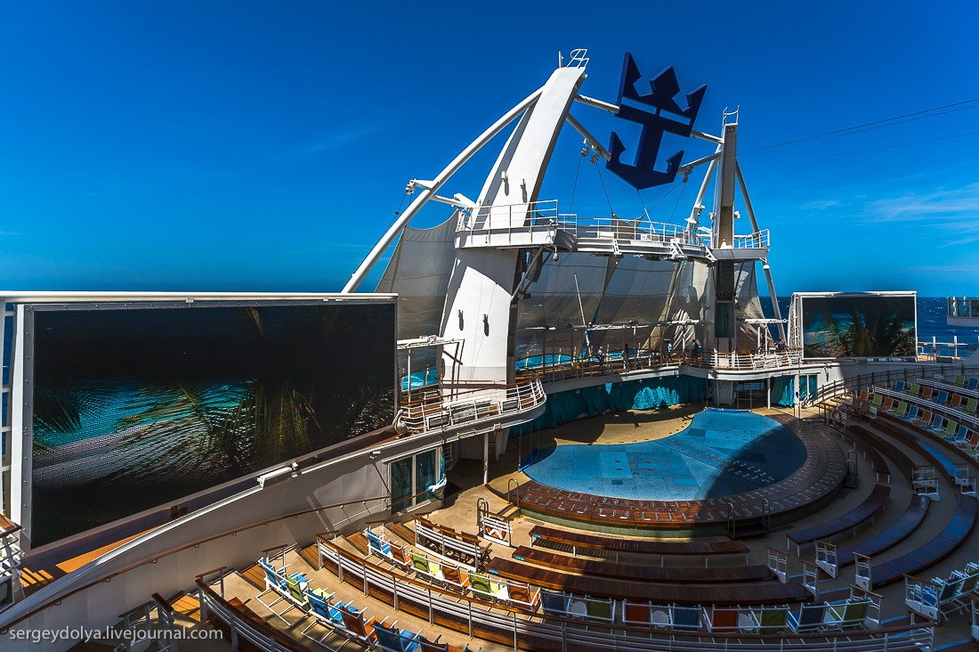 Рассказывает блогер Сергей Доля: "Представьте себе квартал Лас-Вегаса, который плывет из города в город. Представьте корабль на 7500 человек, из которых 2500 - сотрудники и персонал. Добавьте к ним ледовый каток, волейбольные и баскетбольные площадки, поле для гольфа, зал для боулинга, стены для скалолазания, фитнес-центр, SPA-салон, бесконечные бассейны и вы получите самый большой круизный лайнер в мире - Allure of the Seas".