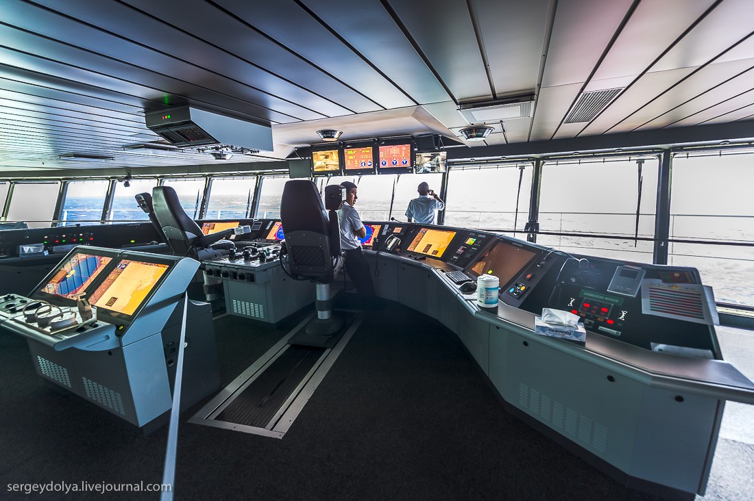 У корабля нет штурвала. Три винта двигателя вращаются на 360 градусов, их выставляют либо вручную с помощью трех вращалок (на переднем плане фотографии), либо с помощью компьютера. Система следит за курсом и подруливает.