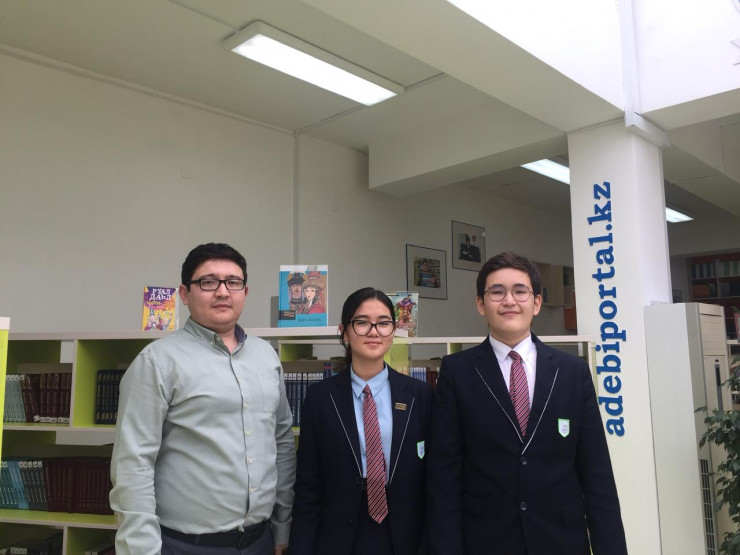 Слева направо: учитель Бауыржан Шоканов, Жаннур Айип и ее напарник Данияр Чутенев.
