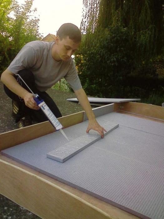 Между разделами используем изоляцию - из пенопласта или стекловолокна. Накрываем все крышкой из тонкой фанеры. Изоляции вокруг отверстия для входа и выхода воздуха в солнечном коллекторе уделяем особое внимание.