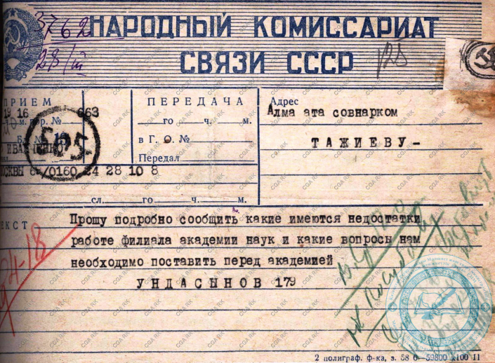 Бурный рост Казахского филиала в последующие годы и, наконец, превращение филиала в Академию наук Казахской ССР в значительной мере обязаны тому большому вниманию, которое было оказано развитию науки в Казахстане со стороны ЦК КП (б) Казахстана в лице секретаря ЦК товарища Шаяхметова, председателя СНК товарища Ундасынова и его заместителя товарища Шарипова..."