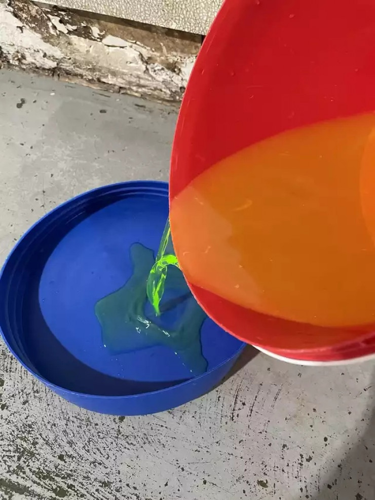 Пользователь Reddit под ником bipnoodooshup поделился фотографией двух ведер, в которых, на первый взгляд, жидкость разного цвета. В синей емкости находится жидкость зеленого цвета, а белая емкость заполнена жидкостью желтого цвета.