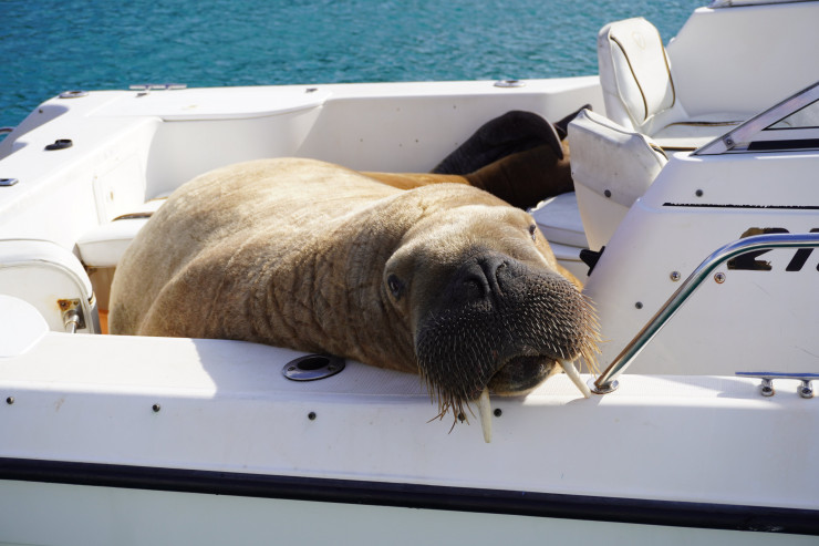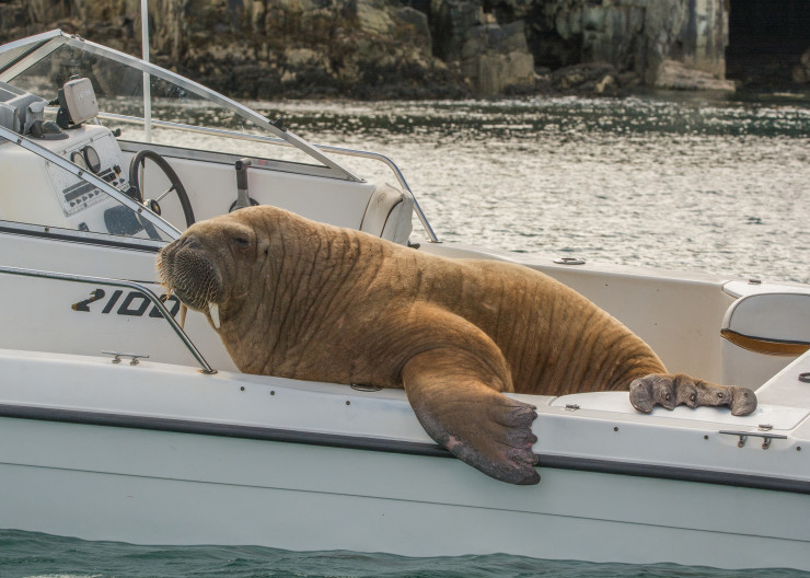 Под огромным весом моржа лодка немного накренилась, но Уолли это никак не волновало, и он продолжил умиротворенно отдыхать.