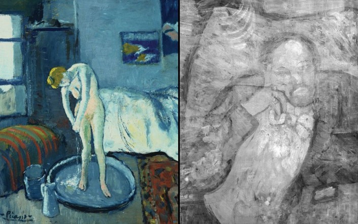 В 2008 году инфракрасное излучение показало, что под "Голубой комнатой" скрыто еще одно изображение - портрет мужчины, одетого в костюм с бабочкой и положившего голову на руку. "Как только у Пикассо появлялась новая идея, он брался за кисть и воплощал ее. Но у него не было возможности покупать новый холст каждый раз, когда его посещала муза", - объяснила возможную причину этого искусствовед Патриция Фаверо.