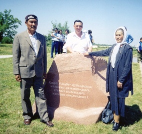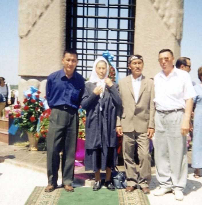Младший брат Садуакасова Курман, двоюродный брат Абдисагит  и младшая сестра Онал у монумента, посвященного жертвам репрессий. 2002 год. Алматы.