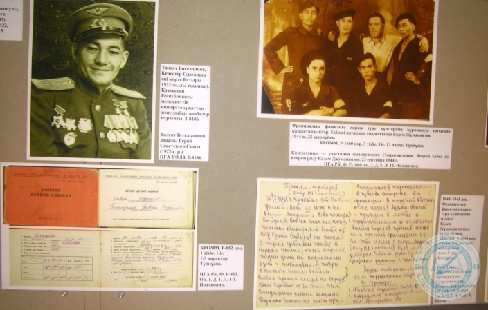 Нам известно, что казахстанцы воевали в составе "Сопротивления против фашизма", образованного в европейских государствах в годы Великой Отечественной войны. Подтверждающие сведения о сражении казахстанцев О. Абдуллина, К. Жуманиязова, П.Я. Раевой и других в составе бельгийских, французских, греческих "Сопротивлений против фашизма" имеются в коллекционном фонде архива.