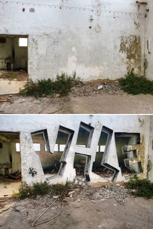При взгляде на граффити кажется, что перед вами окно, дверь или странный проем, но на самом деле это оптическая иллюзия. Взглянув на рисунок несколько раз из разных точек, можно увидеть, что это всего лишь краска.