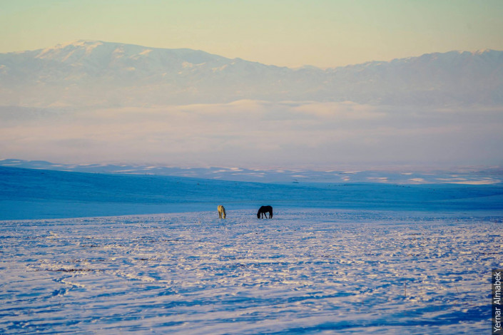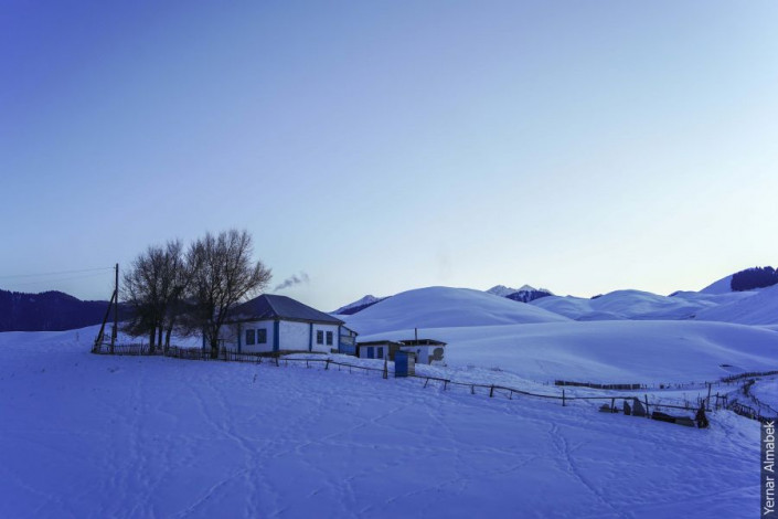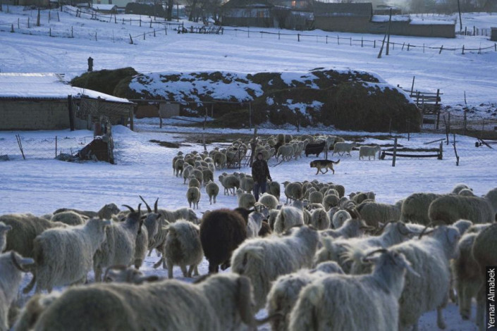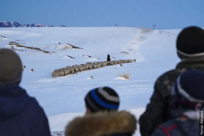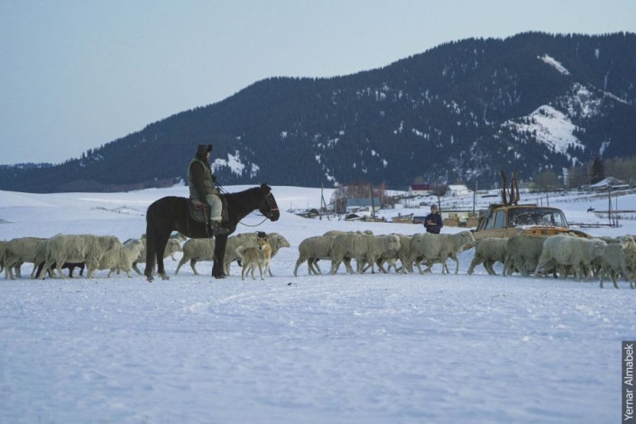 "Около восьми часов за стадом следят пастухи. От кусачего холода их спасает плотная теплая одежда и термос горячего чая. К заходу солнца они уже пригоняют скот домой, потому что важно успеть подсчитать его количество дотемна", - рассказывает Ернар Алмабек.