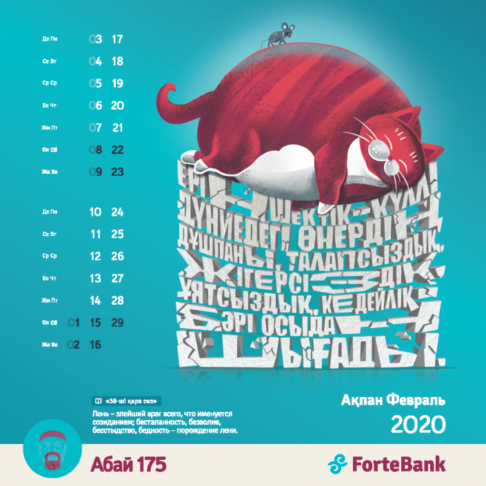 В преддверии нового года ForteBank представил уникальный корпоративный календарь на 2020 год. В нем иллюстраторы из нескольких стран мира попробовали переосмыслить наследие великого казахского поэта Абая Кунанбаева. Материалом для эксперимента стало одно из самых известных и цитируемых произведений Абая - "Қара сөз" - сборник из 45 слов-назиданий.