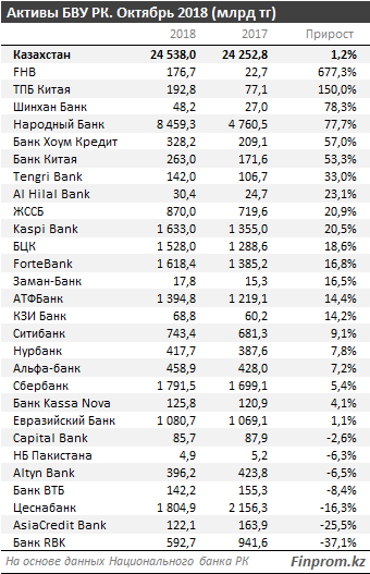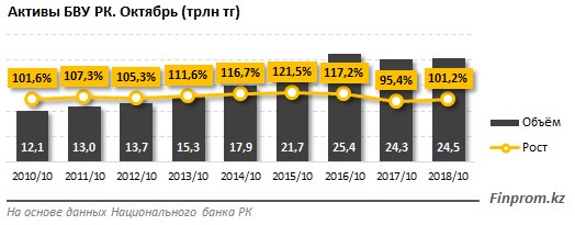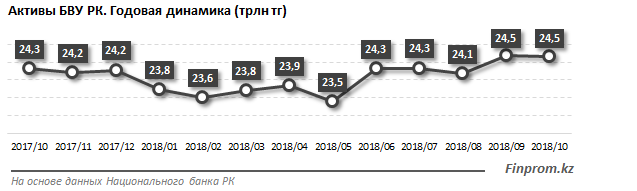 Активы банков Казахстана достигли 24,5 триллиона тенге на конец октября 2018 года, передает Tengrinews.kz со ссылкой на Finprom.kz.
