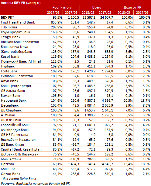 Активы банков за год сократились на 5,6 процента и составили 23,5 триллиона тенге по данным на конец мая 2018 года, сообщает Ranking.kz.