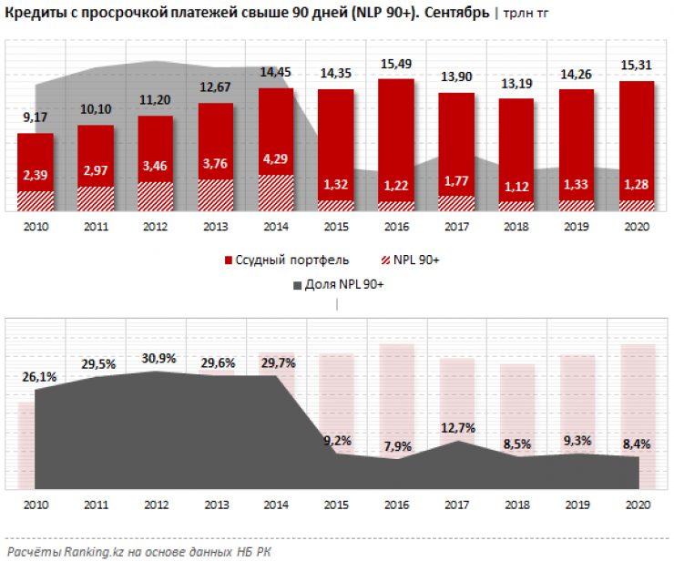 Наряду с ростом объемов кредитования в целом по рынку отмечается улучшение качества займов: так, токсичные займы с просрочкой платежей свыше 90 дней (NPL 90+) за год сократились на 4 процента, до 1,28 триллиона тенге. Это 8,4 процента от совокупного банковского кредитного портфеля против 9,3 процента годом ранее.