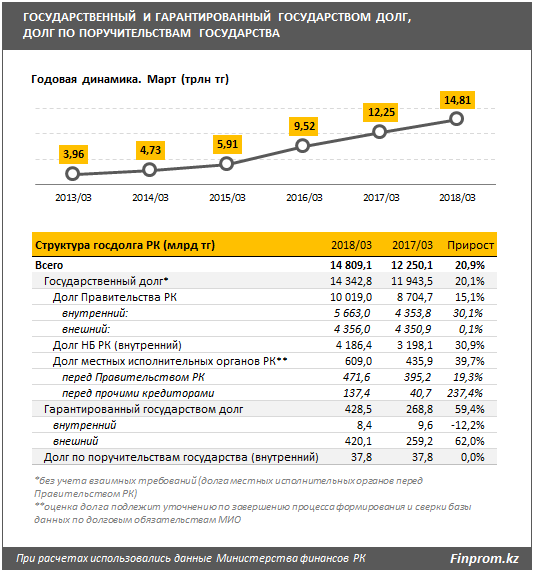 Кумулятивный государственный долг Казахстана в марте 2018 года составил 14,8 триллиона тенге, сообщает Finprom.kz. В общем госдолг, долг, гарантированный государством, и долг по поручительствам государства составили почти 15 триллионов тенге.