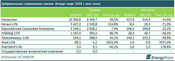 На рынке по страхованию жизни в январе-марте 2018 года работали семь компаний. На одну из них приходится более половины собранных премий - 54,3 миллиарда тенге, рост за год в 2,1 раза. Другая компания является лидером по объему страховых выплат - 256,4 миллиона тенге, что на 22,2 процента больше, чем в прошлом году.
