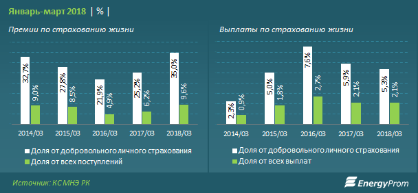 Доля премий по страхованию жизни за январь-март 2018 года составила 35 процентов от добровольного личного страхования и 9,6 процента от всех поступлений. Годом ранее доля премий по страхованию жизни составляла 25,2 процента и 6,2 процента, соответственно.