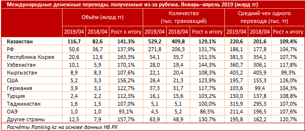 Казахстанцы получили 20,6 миллиарда тенге переводов из Южной Кореи за январь-апрель 2019 года, передает Tengrinews.kz со ссылкой на Ranking.kz.
