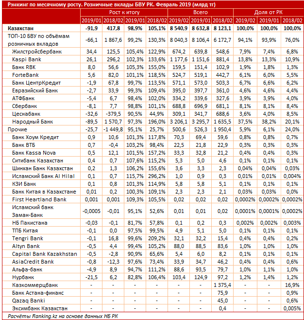 Также в плюсе среди десятки лидеров Kaspi Bank (+26,1 миллиарда тенге за месяц), Bank RBK (+8 миллиардов тенге) и ForteBank (+5,6 миллиарда тенге). Из всех 28 БВУ в плюсе всего 13 банков.