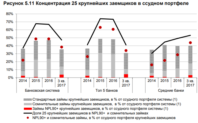 "По всем группам банков отмечается высокая концентрация ссудного портфеля в крупнейших заемщиках. По состоянию на конец третьего квартала 2017 года совокупность займов 25 крупнейших заемщиков каждого банка занимает 35,5 процента ссудного портфеля системы, в отдельных банках концентрация риска в крупнейших заемщиках намного выше. Займы 25 крупнейших заемщиков банковской системы занимают 8 процентов ссудного портфеля", - говорится в документе.