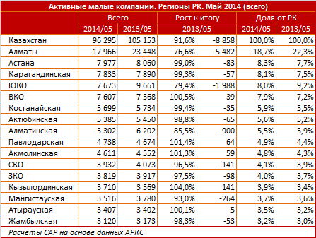 За 2013-2014 годы в Алматы количество активных юрлиц в малом бизнесе сократилось с 23,4 до 18 тысяч. В Южно-Казахстанской - с 9,6 до 7,6 тысячи. В Астане за год количество активных юрлиц в малом бизнесе сократилось с 8,1 до 7,9 тысячи.