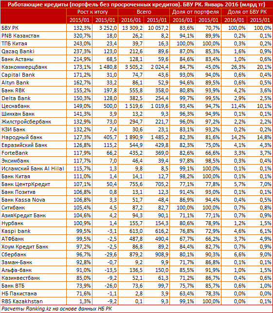 Работающий кредитный портфель (без просроченных займов) в январе показал годовой рост в 25 банках из 35. Наибольший рывок сделали два банка с иностранным участием. ДБ PNB Казахстан (бывший Данабанк, 49 процентов акций принадлежит индийскому Punjab National Bank) с низкого старта нарастил работающий кредитный портфель более чем в три раза. ТПБ Китая (дочерний банк китайского государственного ICBC - Industrial and Commercial Bank of China), также занимающий незначительную долю на казахстанском рынке, увеличил объем выданных кредитов почти в 2,5 раза. Примечательно, что ТПБ Китая является одним из двух банков в РК (вместе с Ситибанк Казахстан), в портфеле которых нет просроченной задолженности.