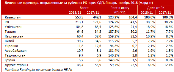 Среди стран, куда были переведены средства через системы денежных переводов за январь-ноябрь текущего года, лидирует Россия: 213,1 миллиарда тенге, рост за год - на 24,2 процента. Доля страны выросла с 38,2 процента до 38,5 процента.