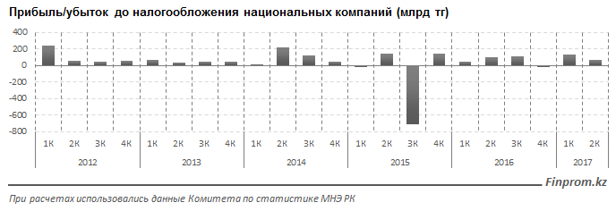 Прибыль нацкомпаний Казахстана сократилась до 67 миллиардов тенге во втором квартале 2017 года, сообщает Finprom.kz. Это падение в два раза по сравнению с первым кварталом, когда этот показатель составлял 131,6 миллиарда тенге.