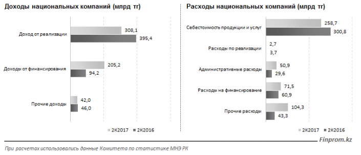 При этом сообщается, что прирост выручки идет не от продаж профильных товаров и услуг нацкомпаний, а от финансовой деятельности (в том числе вознаграждения по банковским вкладам). В частности, доходы от реализации товаров и услуг по сравнению с апрелем-июнем 2016 года снизились на 22,1 процента (или на 87,4 миллиарда тенге), а доходы от финансирования - в 2,2 раза, или на 111 миллиардов тенге.