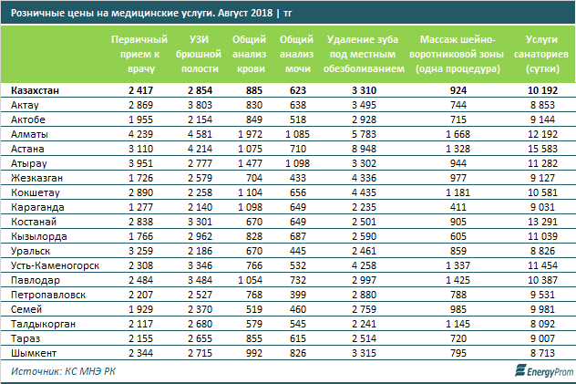 К осени первичный прием у врача подорожал на 8 процентов за год, до 2,4 тысячи тенге по итогам августа. Обследования и анализы выросли год-к-году в цене на 5-6 процентов: УЗИ брюшной полости - до 2,9 тысячи тенге, общий анализ крови - до 885 тенге, мочи - до 623 тенге.