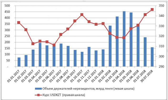 По состоянию на 30 июля 2018 года объем держателей-нерезидентов составляет 158,5 миллиарда тенге (эквивалент 0,45 миллиарда долларов), за последние 4 месяца нерезиденты вышли из рынка ценных бумаг на сумму порядка 900 миллионов долларов (с учетом значений курса тенге на момент выхода), что не могло не отразиться на валютном рынке.