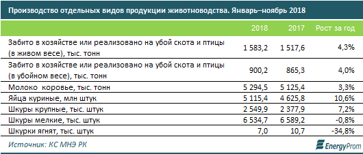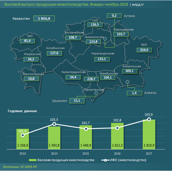 За январь-ноябрь 2018 года валовой выпуск отрасли животноводства увеличился почти на 13 процентов год-к-году, до 1,8 триллиона тенге.