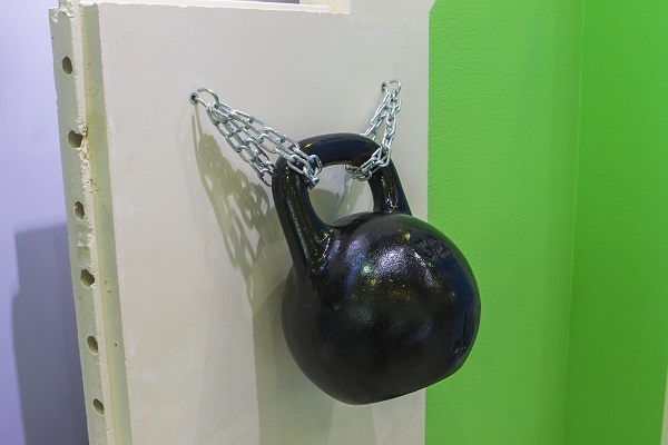Выставочный стенд "ВОЛМА" без лишних объяснений позволяет убедиться в прочности и надежности компании и ее материалов. Конструкция из пазогребневых плит легко выдерживает гирю весом в 32 килограмма, примерно столько же весит кухонный навесной шкаф.