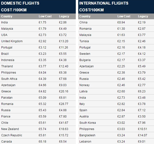 Рейтинг, основанный на анализе более миллиона вылетов, состоит из двух частей: стоимость 100 километров полета для внутренних и для международных рейсов. Указаны цены авиакомпаний-лоукостеров (бюджетных) и классических авиакомпаний.