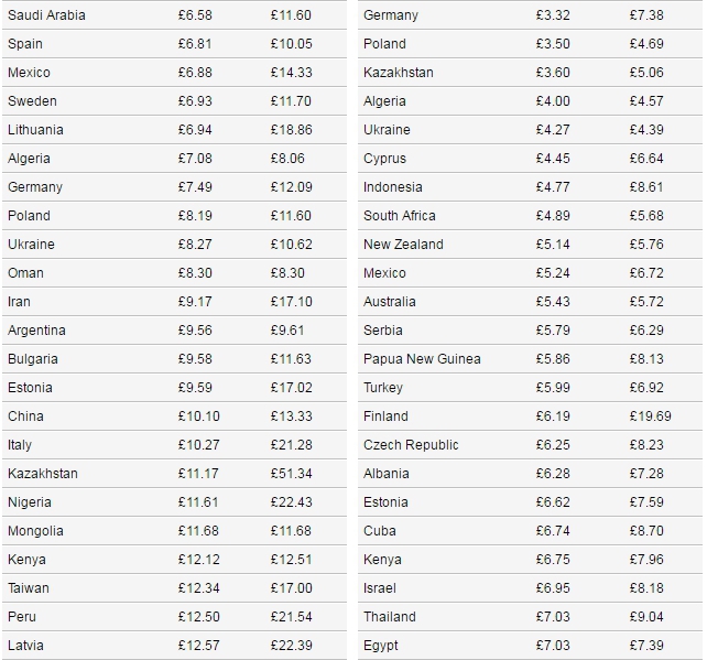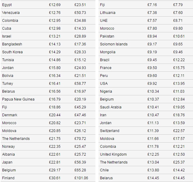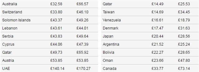 На международных направлениях наиболее низкая стоимость полета в Китае - от 0,94 до 2,19 фунта стерлингов (1,26-2,93 доллара). Наиболее высокая - в Канаде - от 33,77 до 73,14 фунта стерлингов (45,26-73,14 доллара) на 100 километров.