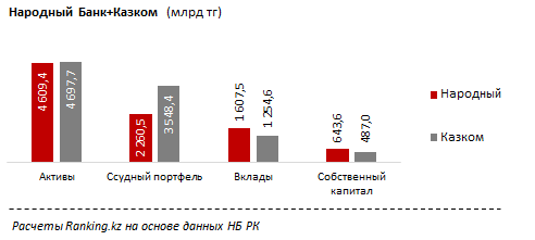 Казком и Народный - крупнейшие банки РК, по объему активов они занимают первое и второе места соответственно, отмечают аналитики. На конец февраля портфель активов Казкома составлял 4,7 триллиона тенге, у Народного - 4,6 триллиона тенге.