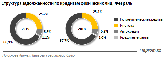 Совокупная ссудная задолженность казахстанцев перед кредитными организациями перевалила за 6 триллионов тенге. Объем кредитов, выданных банками Казахстана физическим лицам, за февраль 2019 года составил 360 миллиарда тенге - на 4 процента больше, чем в прошлом месяце, и на 31,3 процента больше по сравнению с февралем 2018 года.