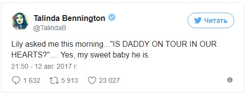 На своей странице в "Твиттере" она поделилась с читателями этим самым вопросом шестилетней дочери Лили об отце. "Лили спросила меня сегодня утром... "Папочка сейчас на гастролях в наших сердцах?"... Да, моя сладкая девочка, он там", - написала Талинда.