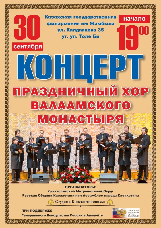 Кроме того, 30 сентября Праздничный хор Валаамского монастыря даст концерт в Казахской государственной филармонии имени Жамбыла (улица Калдаякова, 35, угол улицы Толе би). Начало в 19.00.