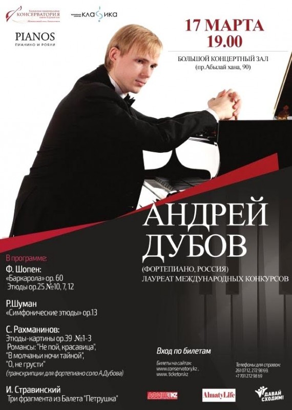 Известный российский музыкант Андрей Дубов выступит с сольным концертом в консерватории имени Курмангазы, передает корреспондент Tengrinews.kz. Выступление состоится 17 марта в 19.00 в Большом концертном зале Казахской национальной консерватории имени Курмангазы (проспект Абылай хана, 90).