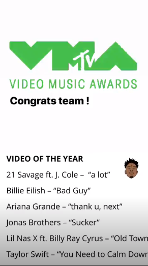 Клип на песню A Lot поборется за звание "Лучшее видео года". Конкуренцию ему составят Bad Guy Билли Айлиш, Thank u, next Арианы Гранде, Sucker Jonas Brothers, Old Town Road (Remix) Lil Nas X и Билли Рэя Сайруса и You Need to Calm Down Тейлор Свифт.