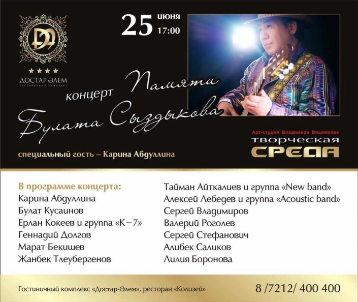 Концерт Памяти Булата Сыздыкова пройдет в Караганде в концертном зале "Достар Әлем" 25 июня, сообщает корреспондент Tengrinews.kz.
