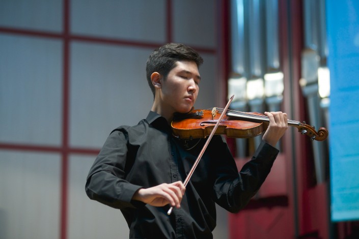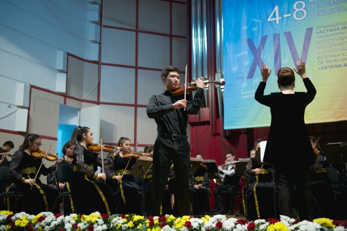 Талантливые инструменталисты блистательно выступили с сольными номерами. Жандос Мухамеди представил первую часть Концерта для скрипки с оркестром Мендельсона, он сумел раскрыть романтически-взволнованную тему чувств выдающегося композитора, вкладывая свою душу, добавляя собственные краски.