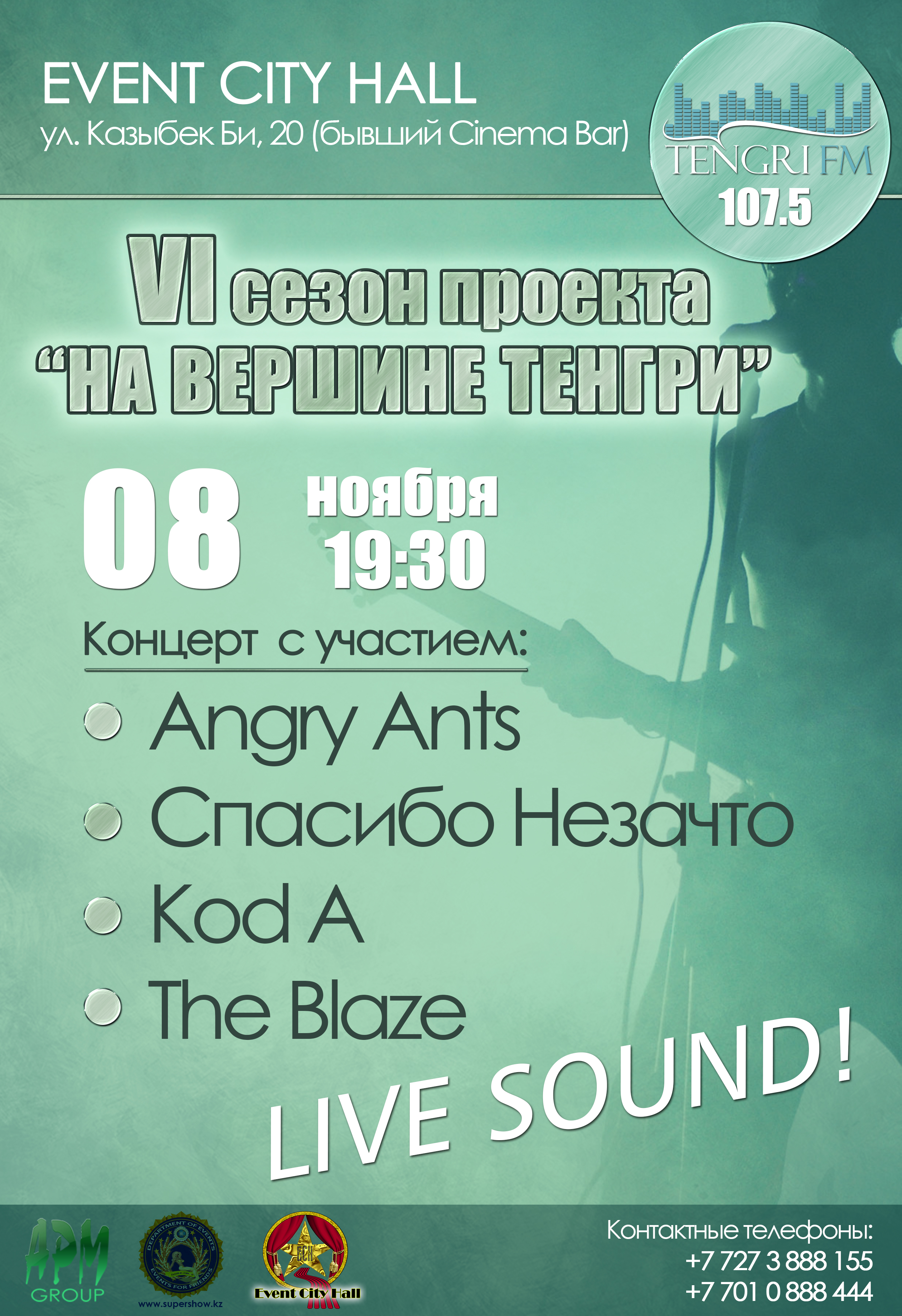 Первый финальный концерт проекта "На вершине Тенгри" состоялся 28 сентября в Алматы. Тогда, по итогам сентябрьской сессии "На вершине Тенгри" победителем стала группа Hadn't tea, которая выступила на одной сцене вместе с экс-фронтменом российской рок-группы "Агата Кристи", нынешним лидером The Matrixx Глебом Самойловым. 24 октября состоялся второй финал, на котором победу завоевал коллектив LampЫ Orchestra. Хедлайнером второго полуфинала была группа "Крематорий". После того, как определится третий финалист, музыканты сразятся за звание лучшей группы VI проекта "На вершине Тенгри", который пройдет в декабре 2014 года. Победители первых двух сессий получили 100 тысяч тенге в качестве приза от партнера проекта - магазина музыкальных инструментов APM music Land.