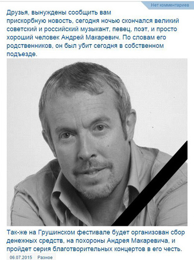"Друзья, вынуждены сообщить вам прискорбную новость, сегодня ночью скончался великий советский и российский музыкант, певец, поэт и просто хороший человек Андрей Макаревич. По словам его родственников, он был убит сегодня в собственном подъезде. На Грушинском фестивале будет организован сбор денежных средств на похороны Андрея Макаревича, и пройдет серия благотворительных концертов в его честь", - говорилось в сообщении.