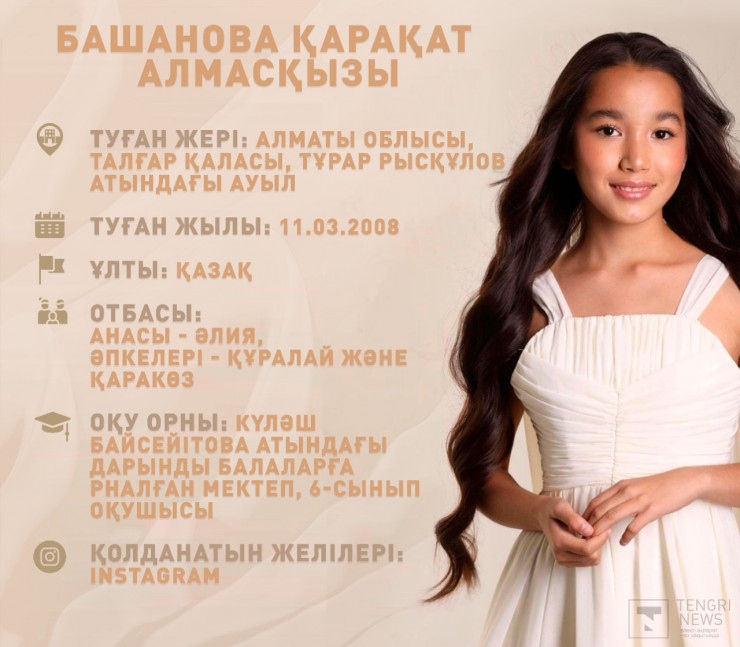 Қарақат Башанова биыл еліміздің атынан "Балалар Евровидениесі" конкурсына қатысып, екінші орын иеленді. Ол өмірден өткен әкесіне арнап финалда Forever әнін шырқады. Қазақстандық жас талант туралы не белгілі? Бұл туралы Tengrinews.kz тілшісі материалында.