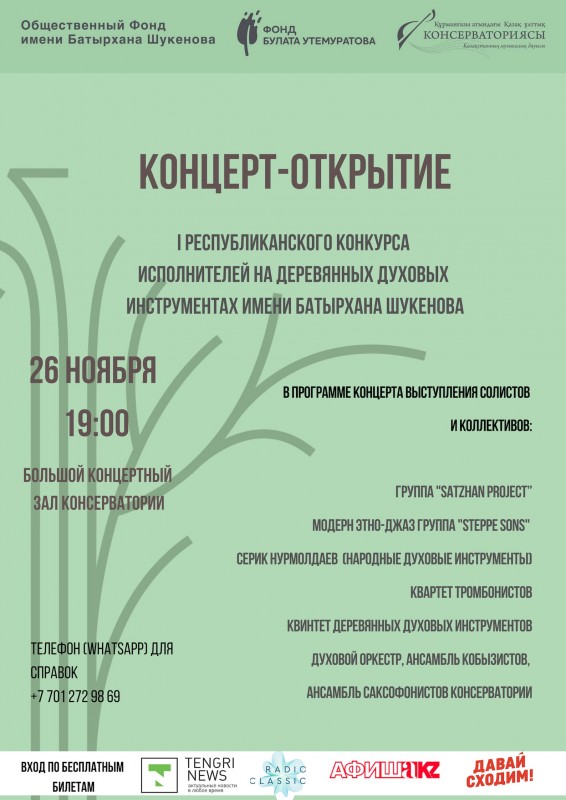 Конкурс пройдет в Алматы с 26 по 30 ноября по пяти номинациям: флейта, гобой, кларнет, фагот и саксофон. Участвовать в нем будут музыканты в возрасте до 32 лет. Имена победителей станут известны 30 ноября. Мероприятие организовано Фондом имени Батырхана Шукенова при поддержке Фонда Булата Утемуратова. Общий призовой фонд конкурса составляет более 5 миллионов тенге. Бесплатные билеты на выступления можно получить в концертном отделе консерватории.