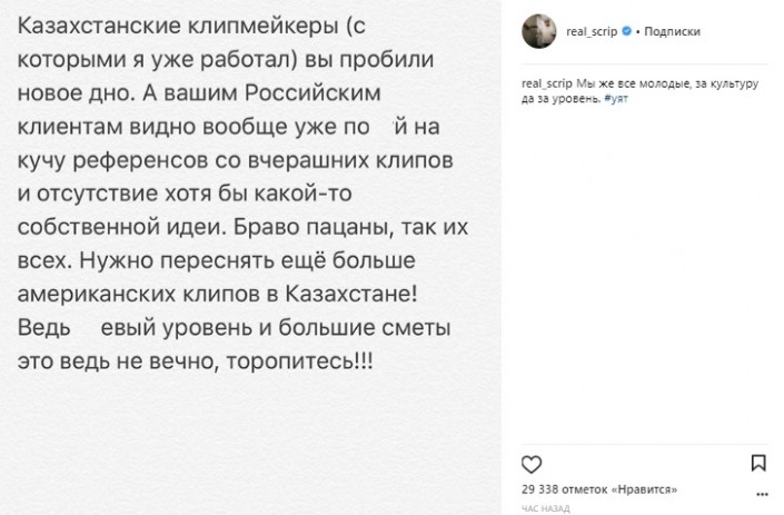 В своем Instagram рэпер опубликовал заметку, в которой заявил, что казахстанские клипмейкеры "пробили новое дно". Скриптонит обвинил их в отсутствии своих идей. "Нужно переснять еще больше американских клипов в Казахстане!"