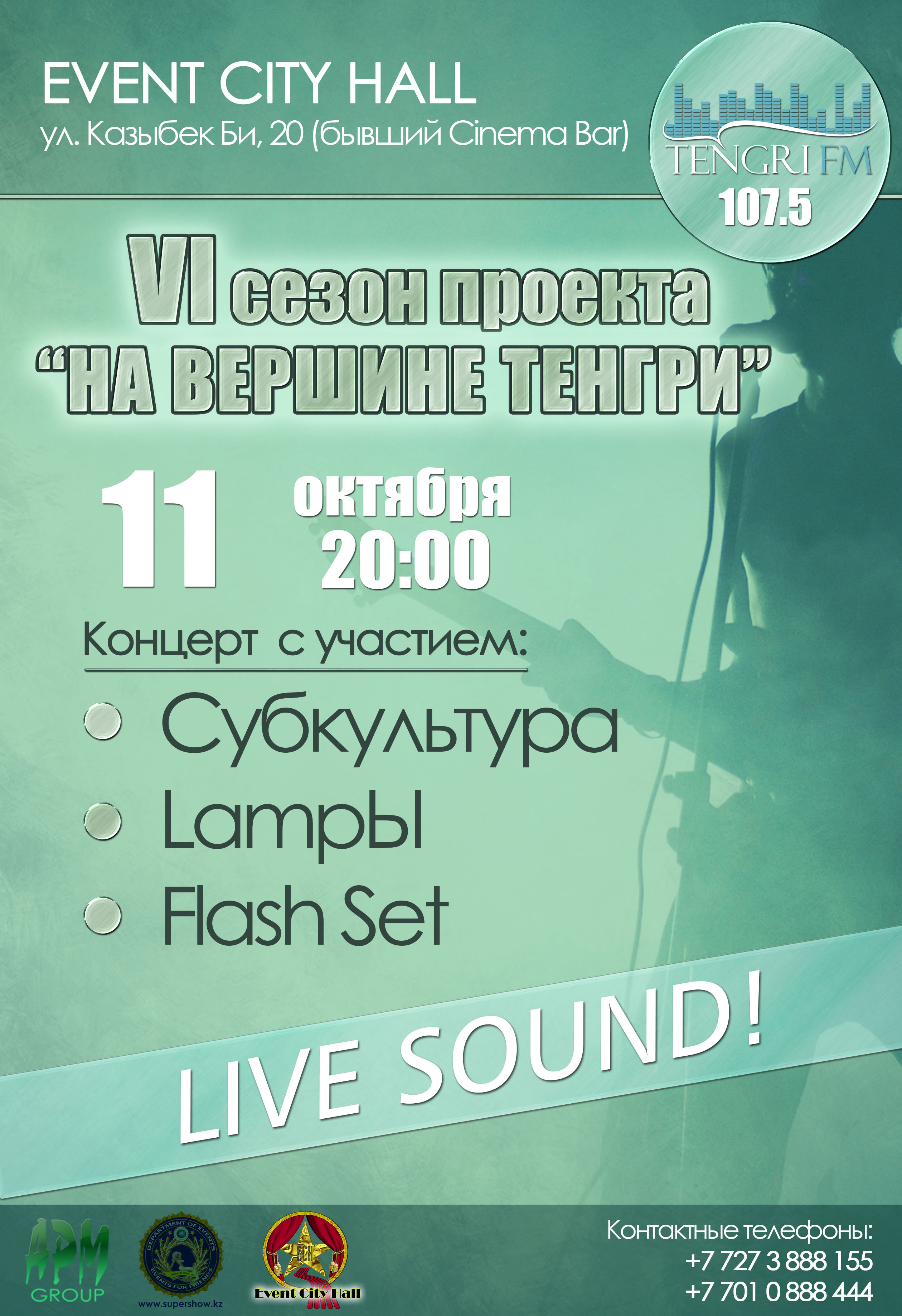Очередной этап октябрьской сессии проекта "На вершине Тенгри" состоится 11 октября в Event City Hall по адресу: улица Казыбек би, 20, угол улицы Калдаякова (бывший Cinemabar). За право попасть в полуфинал и выступить на одной сцене с группой "Крематорий" будут бороться группы "Субкультура" (Усть-Каменогорск), Flash Set (Семей) и LampЫ Orchestra (Алматы), сообщает корреспондент Tengrinews.kz.