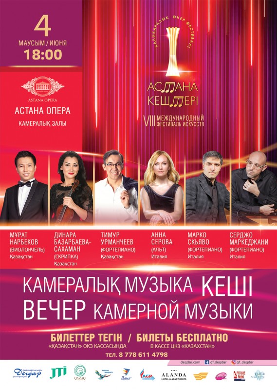 4 июня - "Вечер камерной музыки". Участвуют итальянские и казахстанские мастера сцены. Италию представят всемирно известная альтистка Анна Серова, фортепианный дуэт Марко Скьяво - Серджо Маркеджани. От Казахстана на сцену выйдут прославленный пианист Тимур Урманчеев, лауреаты международных конкурсов скрипачка Динара Базарбаева-Сахаман и виолончелист Мурат Нарбеков.