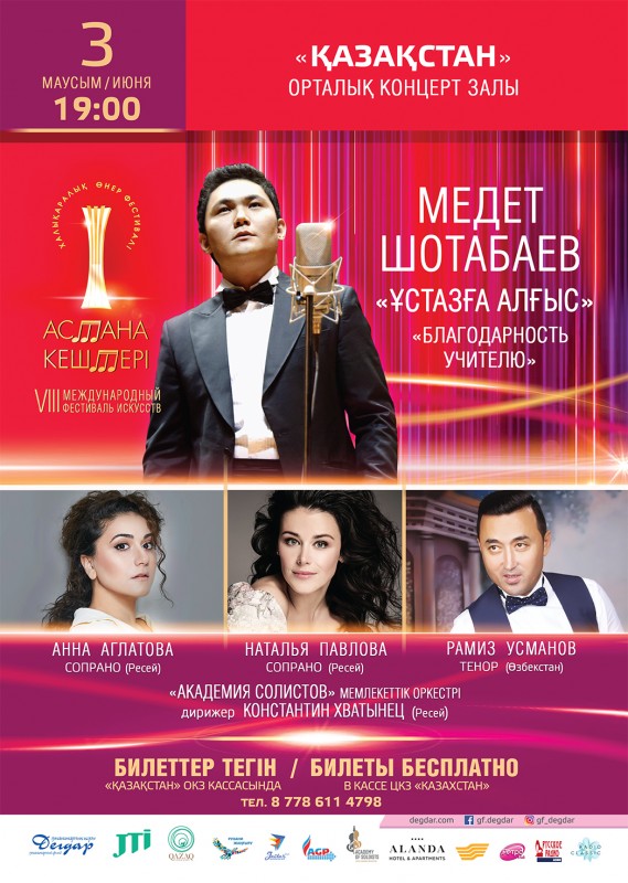 3 июня выступит один из лучших оперных голосов Казахстана, ведущий солист "Астана Опера" Медет Чотабаев. Будучи стипендиатом фонда "Дегдар", Медет прошел обучение в академии вокала у легендарного итальянского мастера Марио Мелани. Гости вечера - ведущая солистка Большого театра России Анна Аглатова, народный артист Узбекистана Рамиз Усманов, солистка Мариинского театра Наталья Павлова.